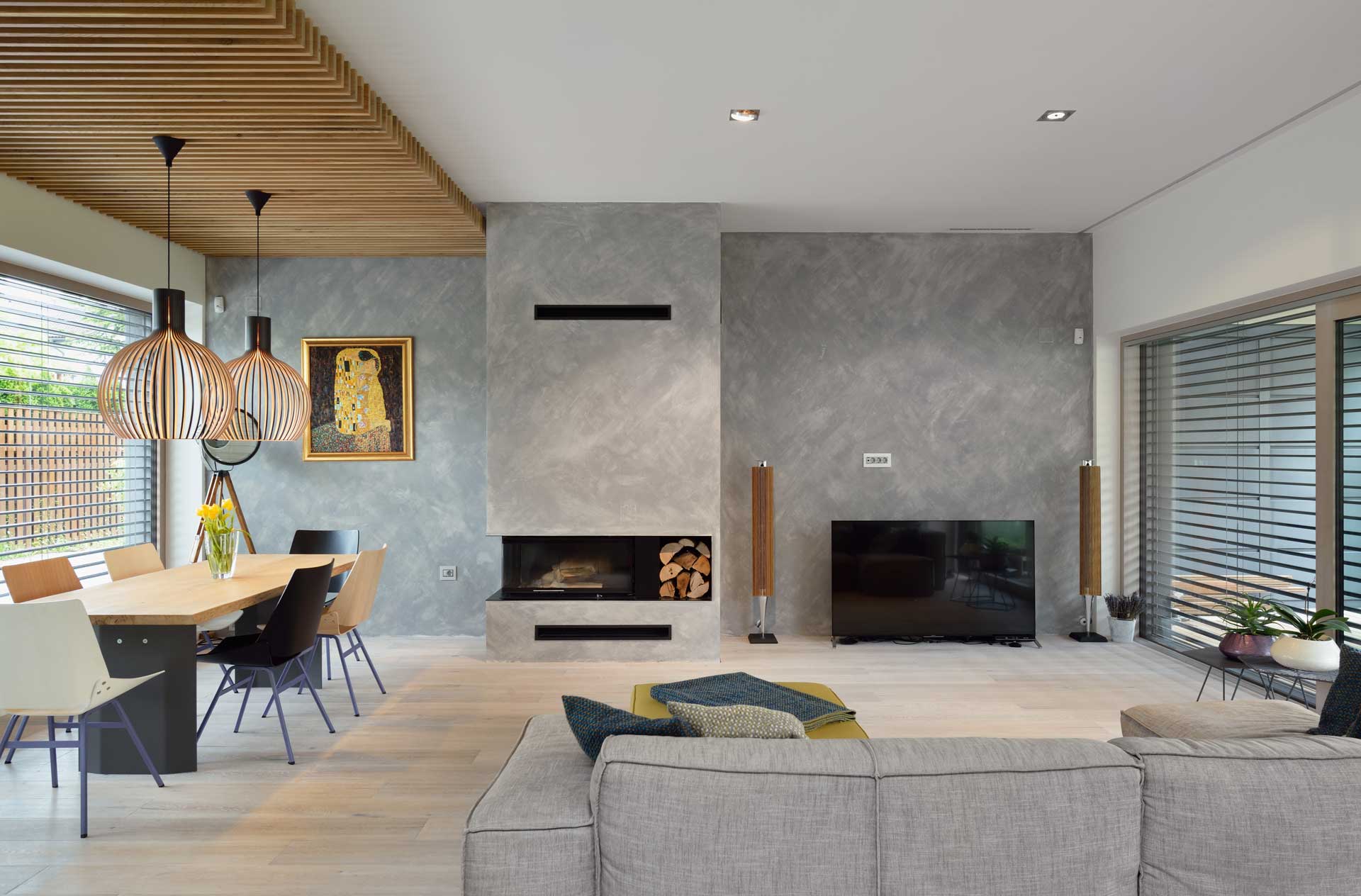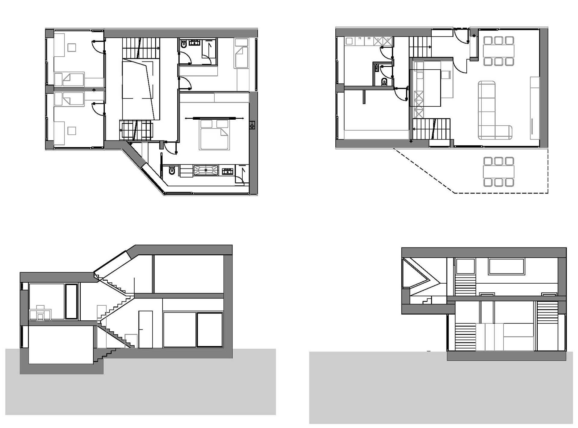 Parcela za to hišo ima le 400m2. Urbanistični pogoji bi nam dovoljevali postaviti hišo v obliki kocke na njeni sredini, s soglasjem sosedov pa smo jo približali parcelnim mejam tako, da je polovica zemljišča ostala vrtu. Hiša je v gosto tkivo Kosez, ki ga sestavljajo individualne hiše iz sredine 80-ih postavljena tako, da ne zastira pogleda ali odvzema osončenja sosedom (izkorišča pasivno osončenje). Mezzaninska organizacija omogoča bivalne programe po etažah, kar je bila želja investitorja. Bivalni prostori s kuhinjo in dnevno sobo so v pritličju in predstavljajo središče hiše. V prvi medetaži so otroške sobe, v nadstropju pa spalnica s kopalnico, savno in delovno sobo. Kompaktnost tlorisne zasnove nadomešča dvovišinski prostor nad kuhinjo, okoli katere se pne stopnišče. Konzola nad teraso, v kateri je savna in kopalnica spalnice staršev, daje dnevnim prostorom intimnost pred pogledi sosedov ter kot podaljšana zunanja dnevna soba, nudi vmesen prostor med zunaj in znotraj.